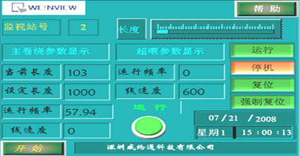 在觸摸屏主界面上,實(shí)時(shí)顯示當前通訊變頻器的各項主要參數,和當前狀態(tài),分為:停機、運行、故障等多檔指示。同時(shí)利用棒圖元件形象直觀(guān)地實(shí)時(shí)顯示了當前絡(luò )筒機的長(cháng)度參數。
